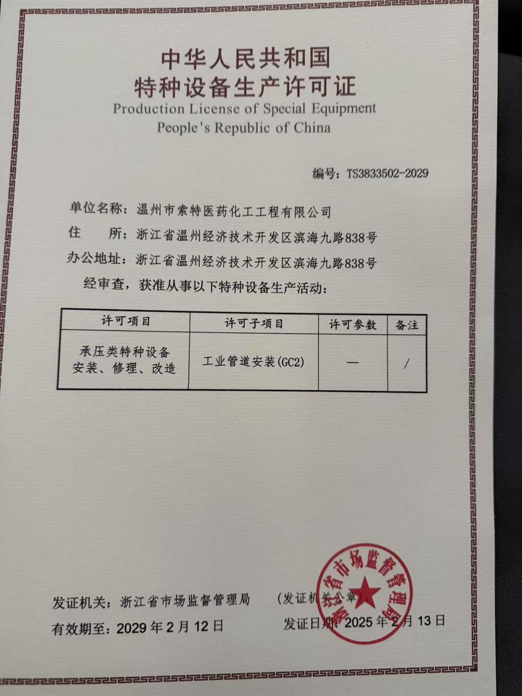 - Nationally Certified Qualifications: The "Special Equipment Manufacturing Permit" was issued by the Zhejiang Provincial Market Supervision Administration. It covers the installation/transformation of industrial pipelines at the GC2 level (valid until 2029).