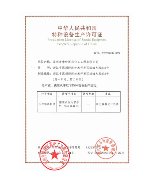 壓力容器制造許可制造商-溫州市索特醫(yī)藥化工工程有限公司