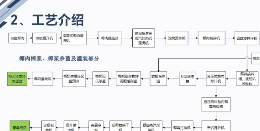 椰肉 → 粉碎 → 壓榨 → 過(guò)濾 → 攪拌 → 蒸發(fā) → 滅菌