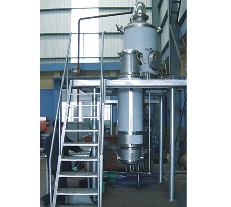 原料液預(yù)熱后由蒸發(fā)器底部進(jìn)入加熱器管內(nèi),加熱蒸汽在管外冷凝。省原科液受熱后沸騰汽化生成二次蒸汽在管內(nèi)高速上升,帶動(dòng)料液沿管內(nèi)壁成膜狀向上流動(dòng),并不斷地蒸發(fā)汽化,加速流動(dòng),氣液混合物進(jìn)入分離器后分離,濃縮后的完成液由分寓器底部放出。這種蒸發(fā)器需要精心設(shè)計(jì)與操作,即加熱管內(nèi)的二次蒸汽應(yīng)具有較高速度,并獲較高的傳熱系數(shù),使料液一次通過加熱管即達(dá)到預(yù)定的濃縮要求。通常,常壓下, 管上端出口處速度以保持20-50m/s為宜,減壓操作時(shí),速度可達(dá)100160m/s