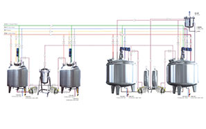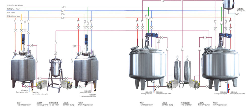 本公司生產(chǎn)的N(X)PG系列濃、稀配罐設(shè)計(jì)合理,工藝先進(jìn),完全符合國家GMP認(rèn)證要求。罐體均采用立式雙層結(jié)構(gòu),內(nèi)膽光潔度Ra0.45 um。內(nèi)簡(jiǎn)體纏繞螺旋帶通蒸汽加熱或通冷卻水降溫,并充填珍珠棉或聚氨脂材料保溫。外層保溫板采用鏡面或磨砂拋光,罐體光澤一致。凡與藥液接觸的部件采用S31603材質(zhì),其余均采用S30408材質(zhì)。內(nèi)罐體底部封頭為凹凸型,采用偏壁式軸向流攪拌,罐體頂部設(shè)計(jì)進(jìn)水口,回流口,消毒口、清洗球、人孔投料口、取樣口、溫度探頭、液位傳感器。配有控制柜操作,儀表顯示藥液溫度、液位,提供上下限報(bào)警等功能。根據(jù)用戶要求,稀配罐可增加充氮?dú)庋b置和PH計(jì)。